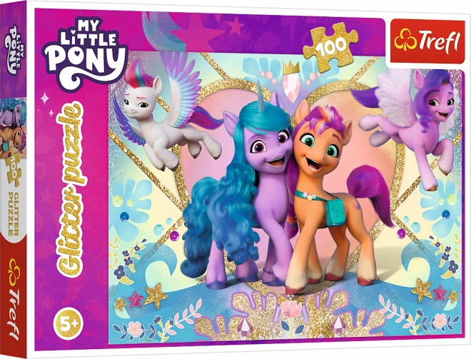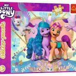 Die Glitter-Puzzles mit 100 Teilen My Little Pony Glitzernde Ponys wurden speziell für Pony-Fans entworfen. Jedes Teil und auch die Verpackung sind mit feinem goldenem Glitzer überzogen, der einen edlen Look verleiht. Durch das Zusammensetzen dieses Puzzles entsteht eine wunderschöne, funkelnde Dekoration fürs Kinderzimmer.