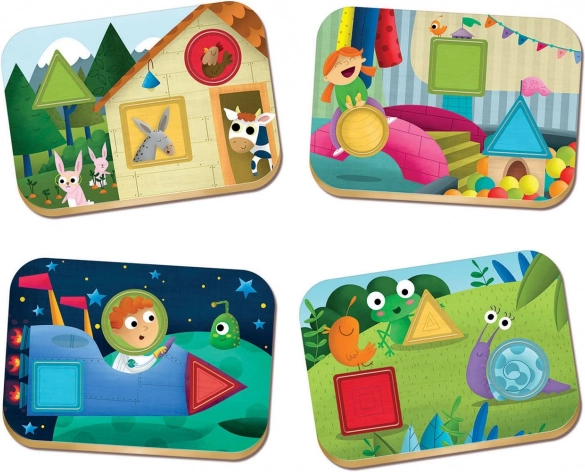 Dieses Spiel fördert die Aufmerksamkeit der Kinder, entwickelt ihre Vorstellungskraft und lehrt sie, grundlegende geometrische Formen und Farben in verschiedenen Umgebungen zu erkennen: auf dem Bauernhof, im Spielzimmer, auf der Wiese und im Weltraum.