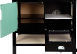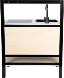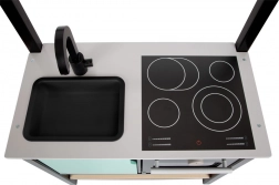 Der Schrank unter der Arbeitsfläche, Haken zum Aufhängen von Utensilien und ein Regal, dessen Boden als Rost genutzt werden kann, sorgen für Ordnung. Der linke Schrankbereich lässt sich als „Kühlschrank“ oder „Geschirrspüler“ verwenden.