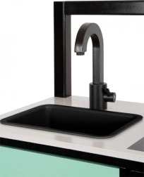 Für maximalen Spielspaß gibt es einen Einhebelmischer zur „Temperatur“-Regulierung, ein herausnehmbares Spülbecken aus Kunststoff zum „Abwaschen“ sowie einen Backofen mit herausnehmbarem Blech. Der Regalboden kann als Grillrost genutzt werden. Der Schrank unter der Arbeitsfläche und die Haken für Utensilien sorgen für Ordnung; der linke Schrankbereich lässt sich spielerisch in einen „Kühlschrank“ oder eine „Spülmaschine“ verwandeln.