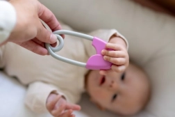 Die rosa-grauen Kontrastfarben fördern die visuelle Wahrnehmung und ziehen den Blick der Kleinen an.