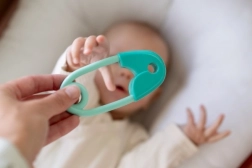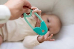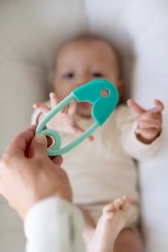 Die großen und abgerundeten Kanten der Sicherheitsnadel sorgen dafür, dass das Spielzeug von Geburt an vollkommen sicher ist.