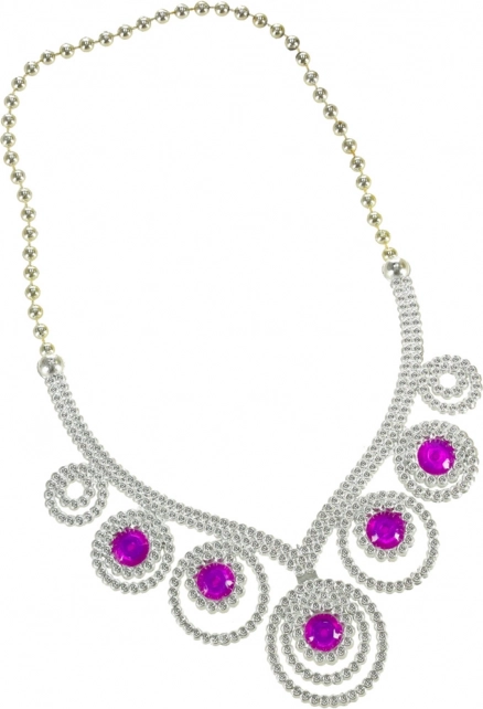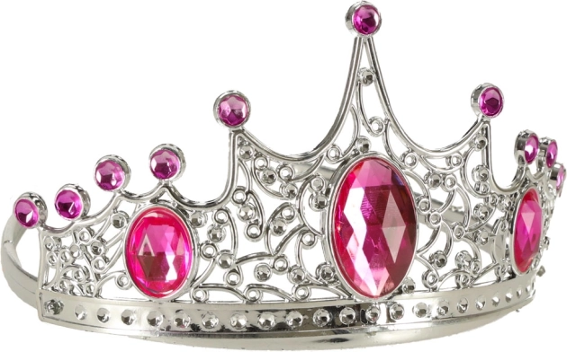 Eine silberne Tiara mit rosa Steinen sowie passende Halskette und Ohrringe verleihen jedem Outfit bezaubernden Glanz. Zwei Ringe runden das Set bis ins letzte Detail ab.