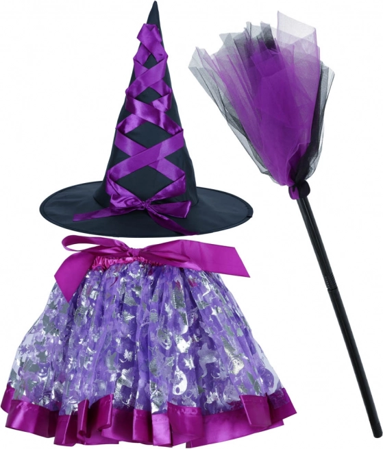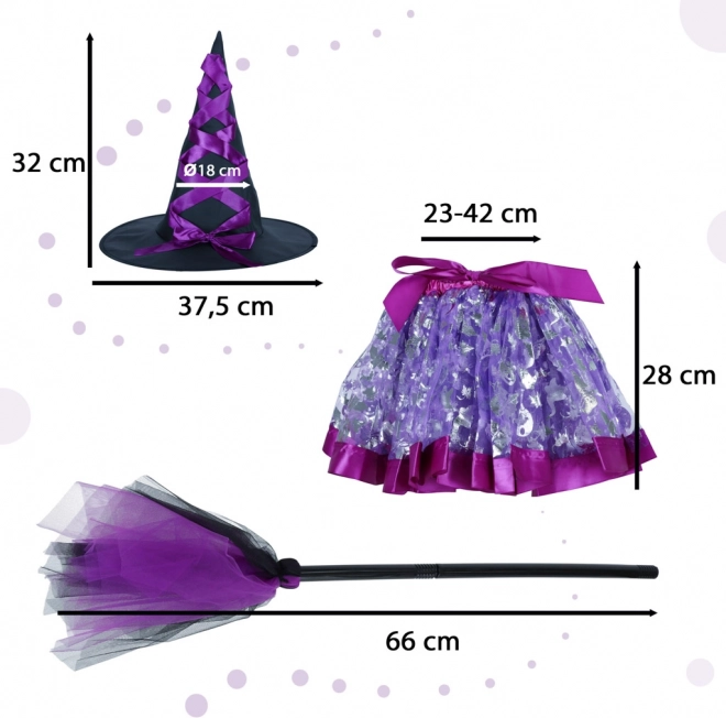 Großartiges Hexenkostüm für Kinder bietet ein komplettes Outfit mit drei Accessoires: schwarzer und violetter Hut, violetter Rock und Zauberbesen. Ideal für Halloween und Mottopartys.