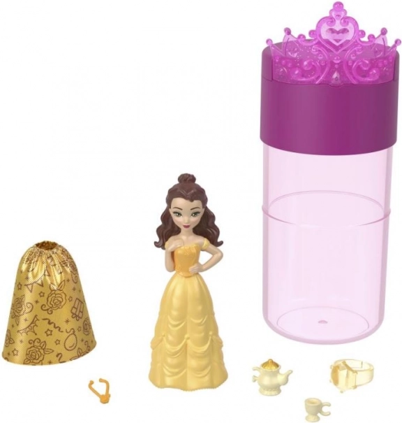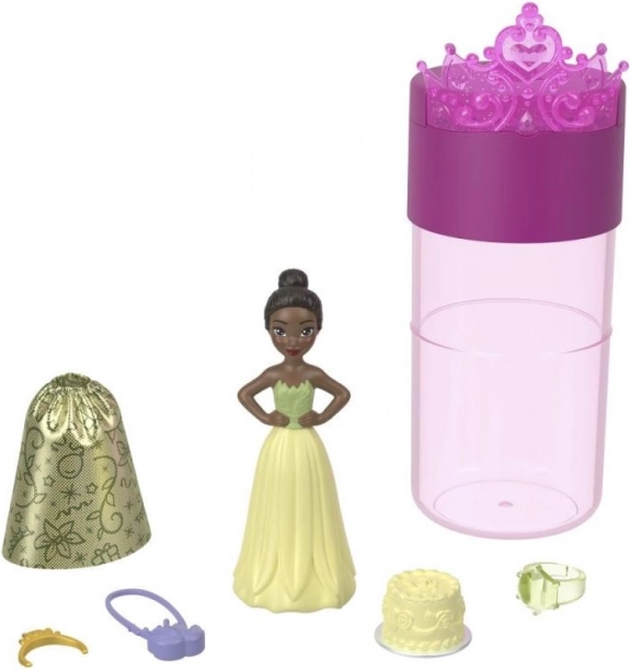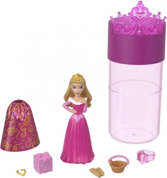 Beginnen Sie mit dem Auspacken der Röhre: Darin finden Sie eine kleine geheimnisvolle Puppe (ca. 3,5"/9 cm) mit einer Color-Reveal-Schicht sowie drei Beutel mit Zubehör. Füllen Sie die Röhre mit Wasser, tauchen Sie die Puppe ein und drehen Sie sie sanft – im Nu zeigt sich ihr charakteristischer Look, inspiriert von den beliebten Disney Filmen.