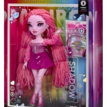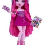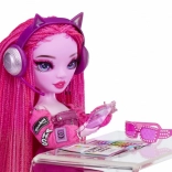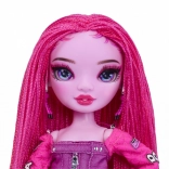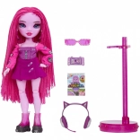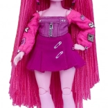 Die Puppe hat lebendig rosa geflochtenes Haar, auffällige blaue Augen und detaillierte Gesichtszüge, die ihren stilvollen Look betonen.