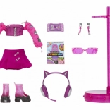 Zur Puppe gehören verschiedene Modeaccessoires, einschließlich rosa Sonnenbrille, Kopfhörer mit Ohren und einem rosa Ständer, die kreatives Spielen fördern und einzigartige Mode-Looks schaffen lassen.