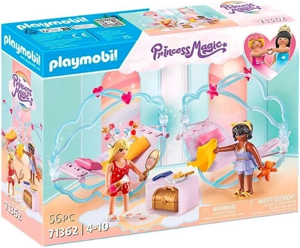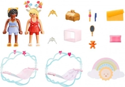 Erleben Sie Abenteuer mit den Regenbogen-Prinzessinnen bei der himmlischen Pyjamaparty von PLAYMOBIL. Bevor sich die beiden Regenbogen-Prinzessinnen in ihre magischen Hängemattenbetten legen, schmücken sie sich mit glitzernden Schmuckstücken. Danach reisen sie in die Welt der Träume und Fantasien mit märchenhaften Figuren und magischen Umgebungen.