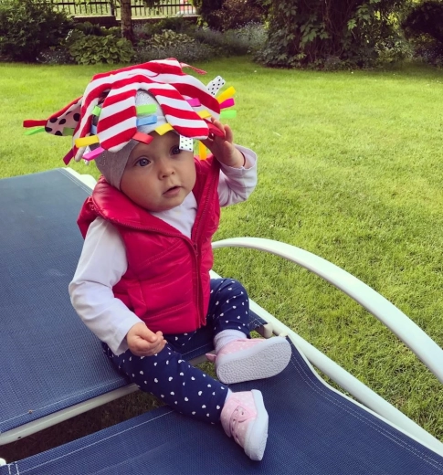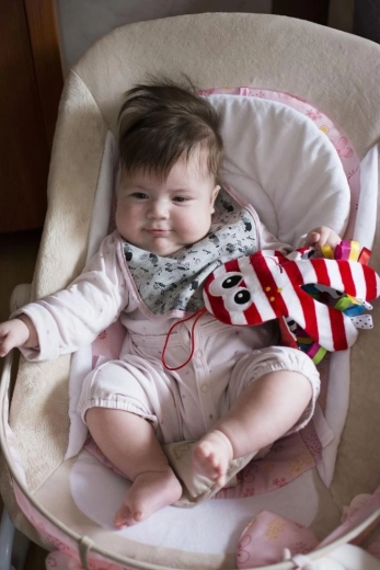 Markante rot-weiße Streifen und schwarze Punkte unterstützen die visuelle Stimulation von Neugeborenen und Säuglingen.