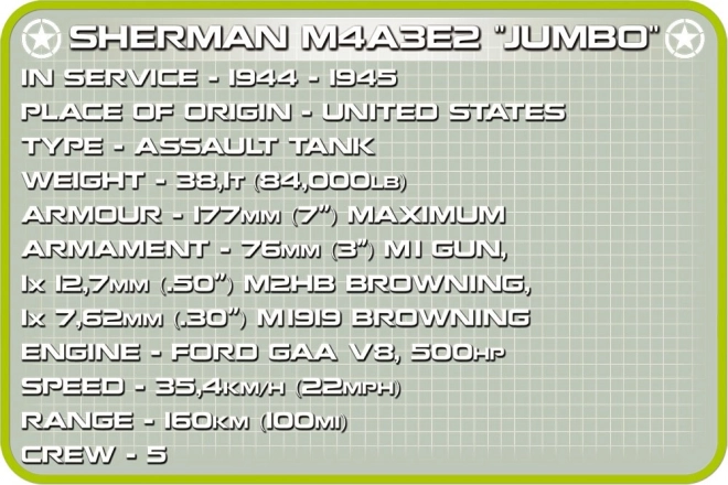 Dieses detailreiche Modell stellt den berühmten Sherman M4A3E2 „Jumbo“ Cobra King dar – den ersten Panzer, der die Linien durchbrach und während der Ardennenoffensive das eingeschlossene Bastogne erreichte. Der COBI-Bausatz bringt einen authentischen Look mit hochwertigen Drucken, die sich auch bei intensivem Spielen nicht abnutzen. Dank funktionaler Elemente wie beweglichen Ketten, drehbarem Turm und öffnenden Luken ist das Modell sowohl zum Ausstellen als auch für dynamisches Spiel ideal.
