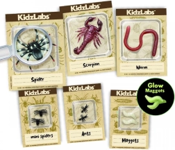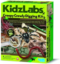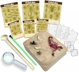 Der Gipsblock verbirgt realistische Figuren von Spinnen, Würmern und Ameisen. Kinder legen sie nach und nach mit dem beiliegenden Meißel und Pinsel frei.