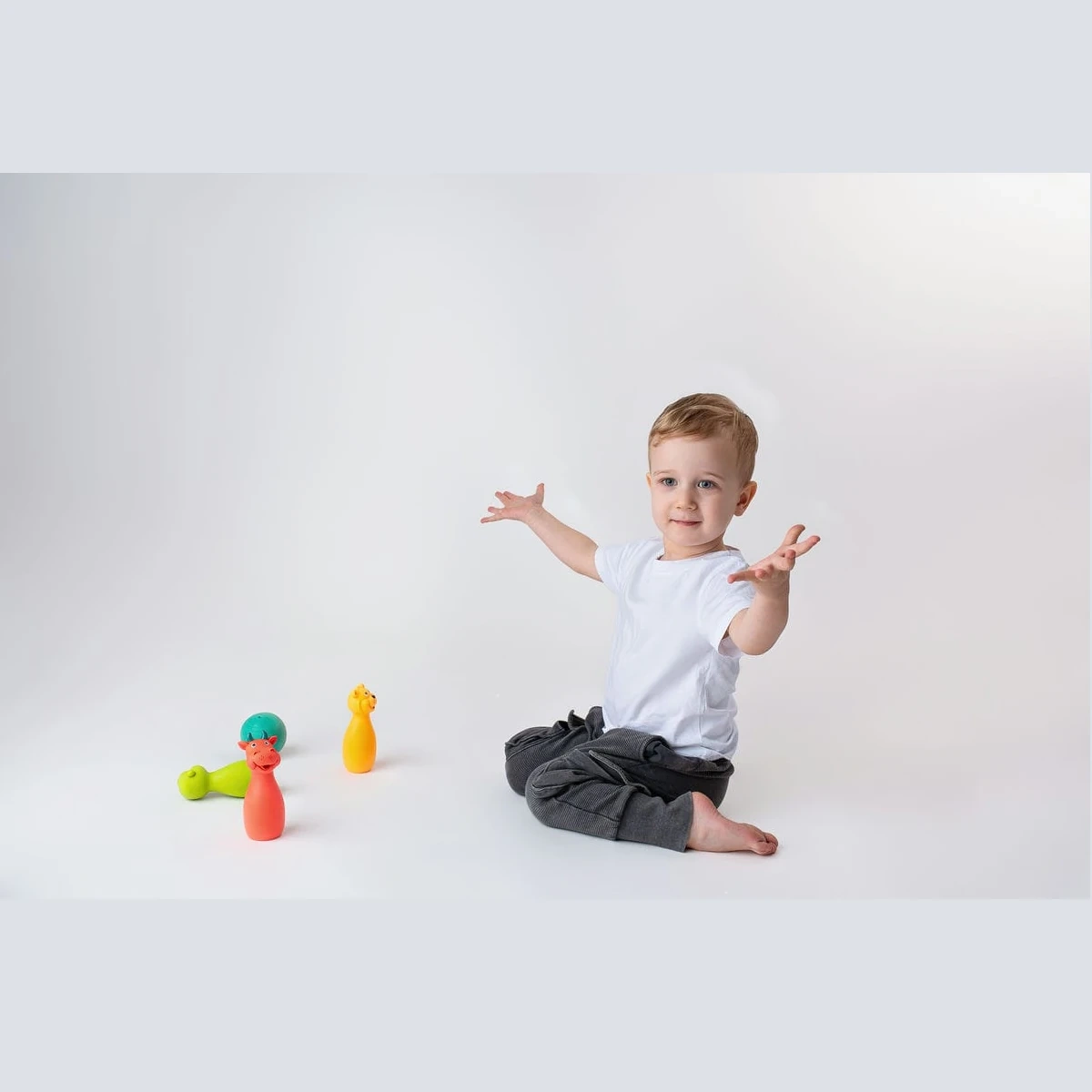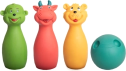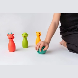 Das Rollen des Balls und das Umwerfen der Kegel fördern spielerisch die Hand-Auge-Koordination, Genauigkeit und Balance.