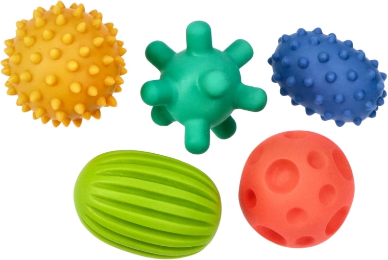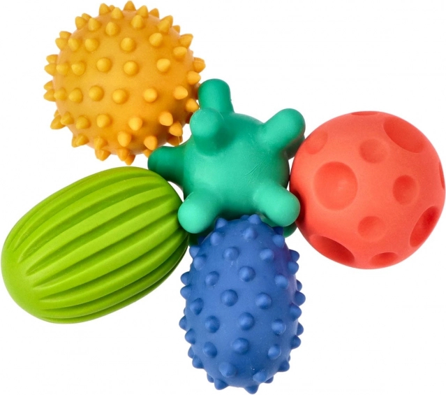 Das Set der Sensorik-Bälle SENSORKY bietet verschiedene Größen und Oberflächen mit Noppen für eine vielfältige taktil-sensorische Stimulation. Unterschiedliche Formen und Pastellfarben ziehen die Aufmerksamkeit des Kindes auf sich, unterstützen die Integration der Sinne und natürliches Lernen durch Spiel – von sanfter Massage bis zu Greifen, Rollen und Werfen.