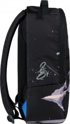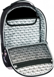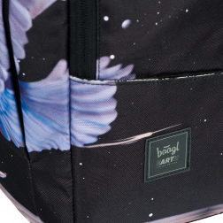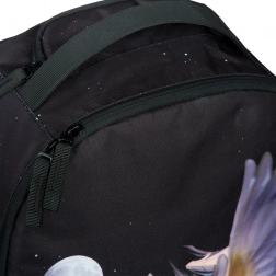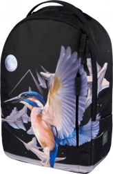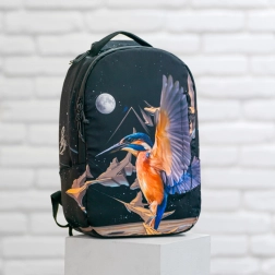Das Design des Rucksacks wird durch ein fliegendes Eisvogelmotiv, zusammen mit abstrakten Formen und einem Mond verziert. Dieser auffällige Druck macht den Rucksack zum Mittelpunkt der Aufmerksamkeit.