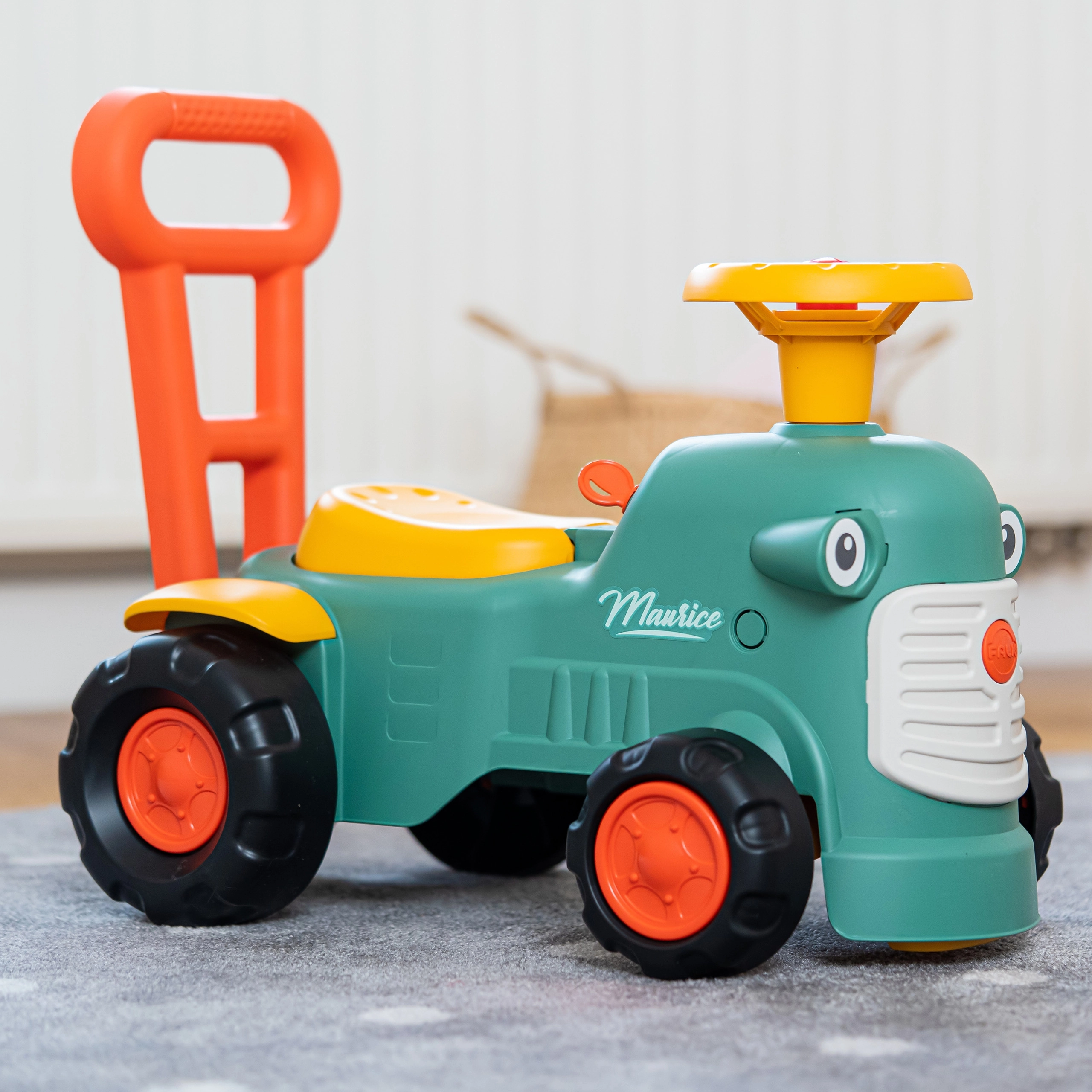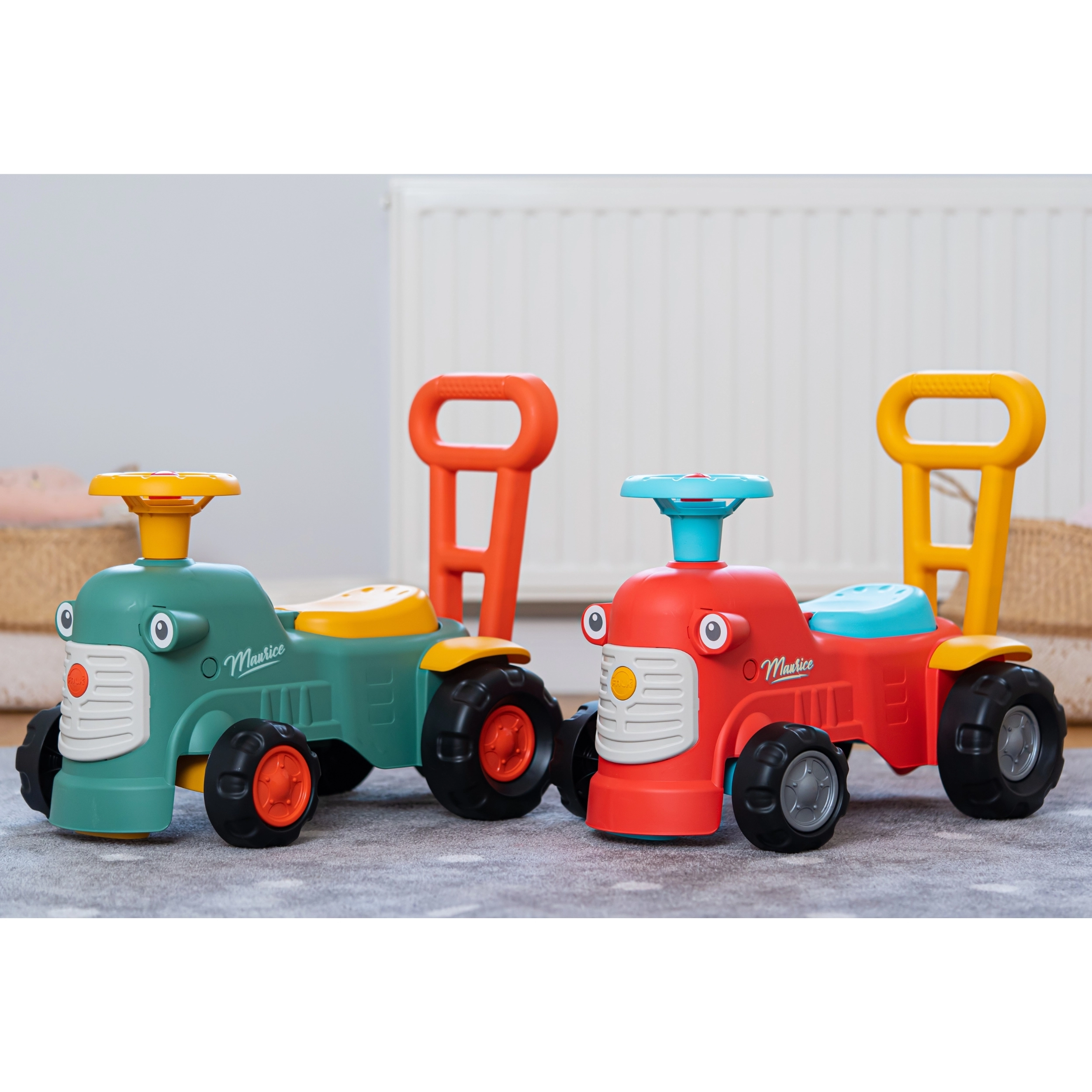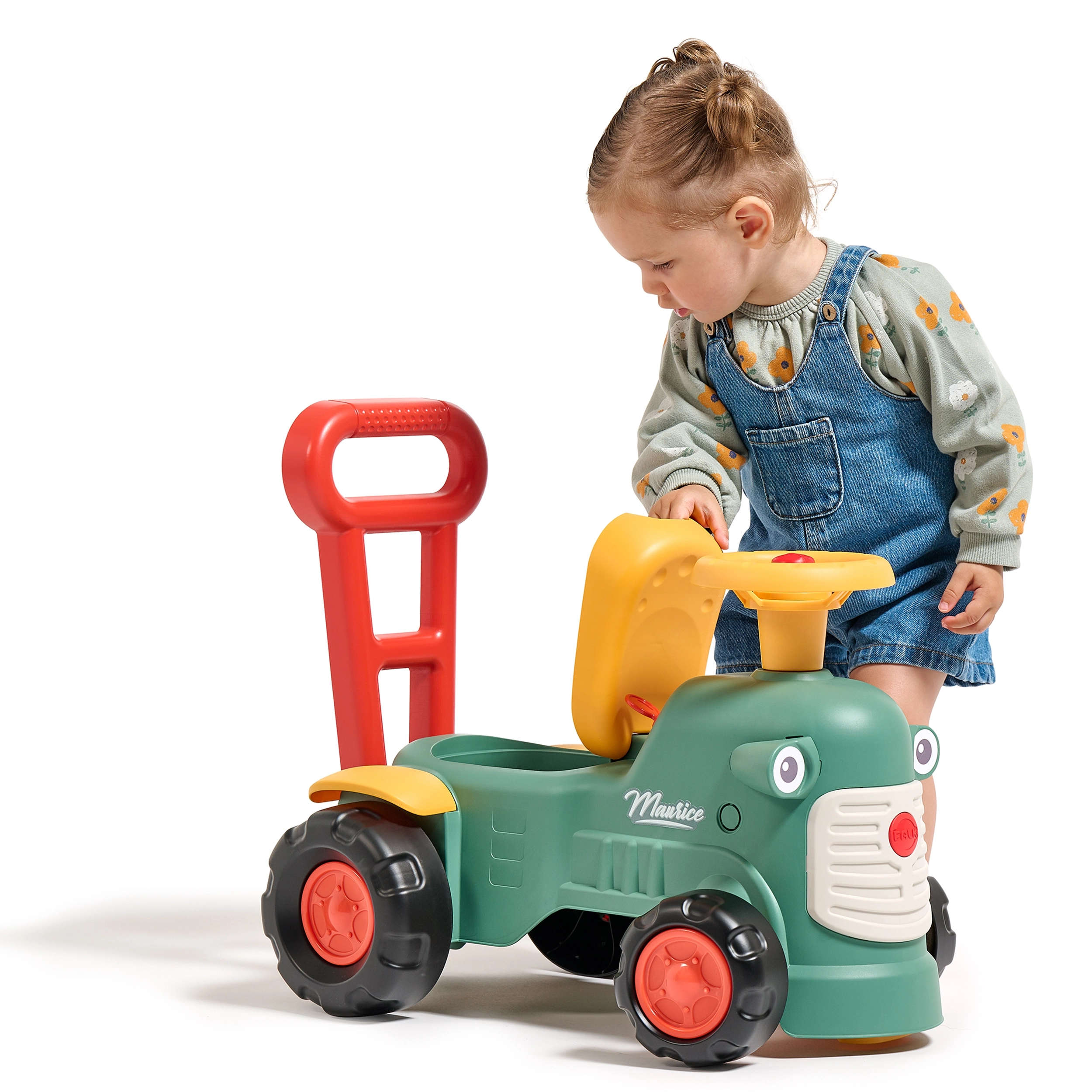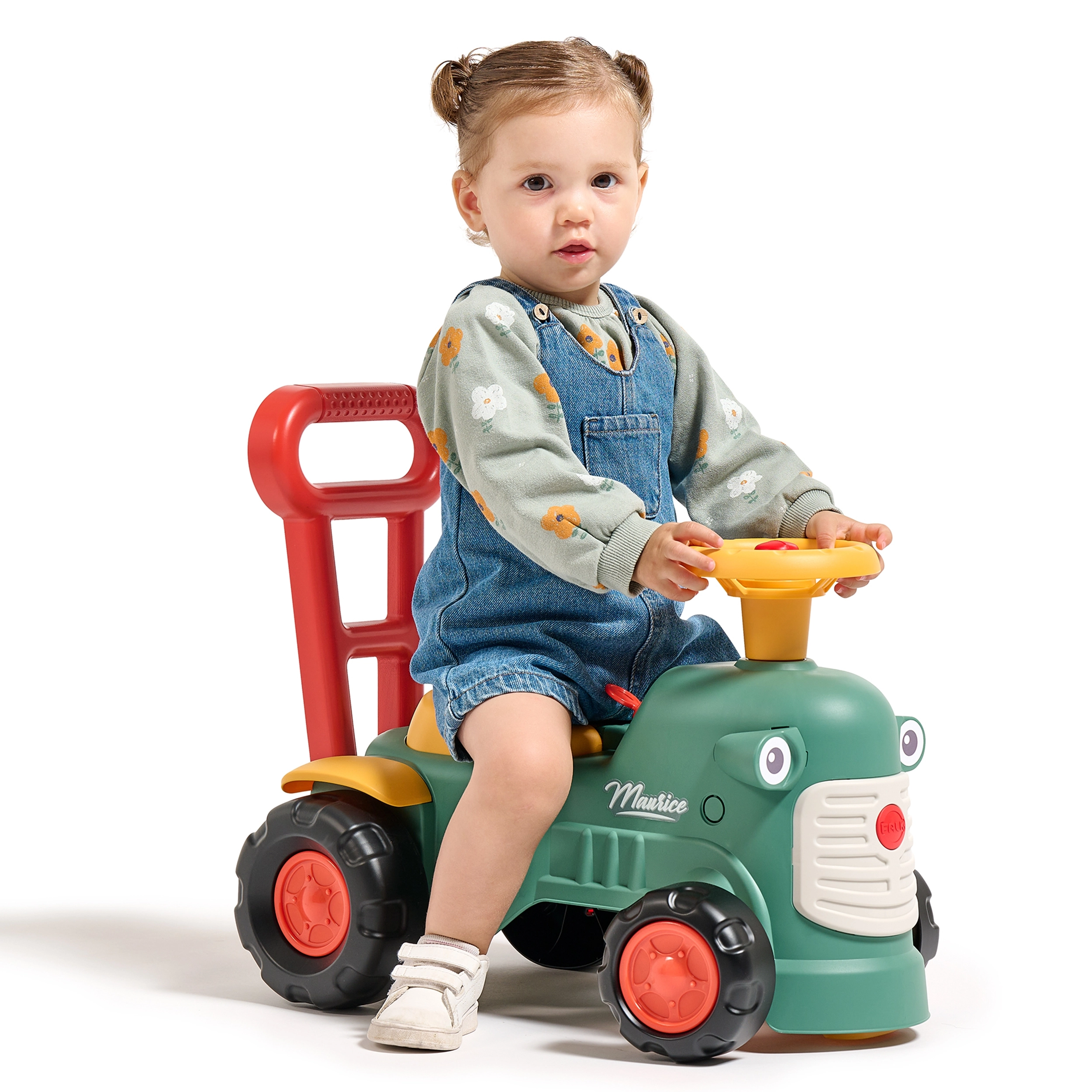 Das Rutschfahrzeug-Traktor FALK Maurice verbindet Fahrspaß mit dem Erlernen des Gehens. Das Kind kann mit dem Lenkrad mit Hupe fahren und steuern oder sich am ergonomischen hinteren Griff hochziehen und die ersten Schritte trainieren. Der niedrige Sitz (ca. 23 cm) erleichtert das Aufsitzen, während die breiten Räder Stabilität auf glatten Böden und Teppichen bieten.