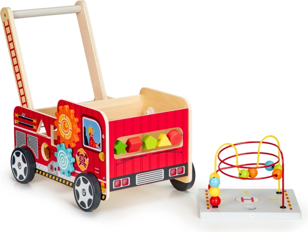Holz-Feuerwehr-Lauflernwagen für Kinder hilft beim Gehenlernen, fördert die Motorik und bietet interaktive Elemente zum Entdecken. Robuste Konstruktion und Platz für den Transport von Spielzeug sorgen für stundenlangen Spaß.