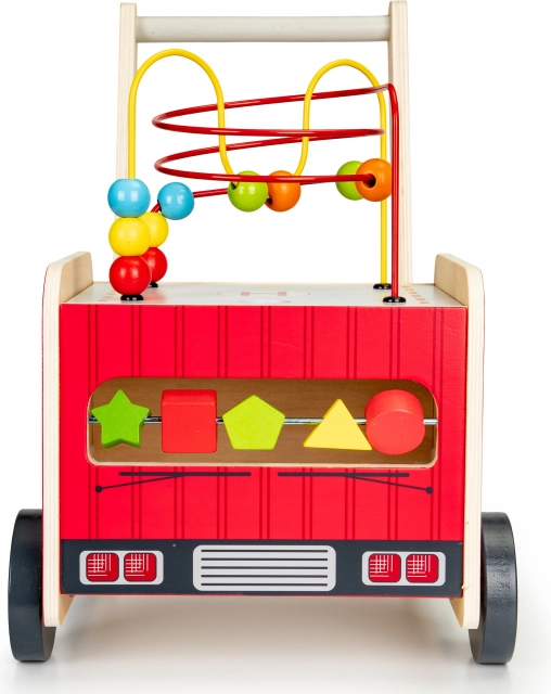 Der Holzlauflernwagen in Form eines Feuerwehrwagens ist der ideale Helfer für die ersten Schritte Ihres Kindes. Der Lauflernwagen ist so konzipiert, dass er Stabilität bietet und gleichzeitig Spaß durch verschiedene interaktive Elemente wie Zahnräder, Perlenlabyrinthe und Formsortierer bietet.