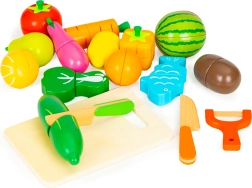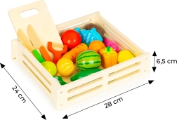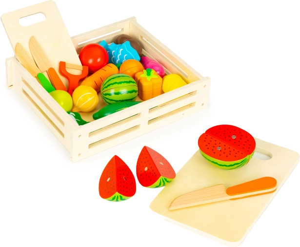 Dank magnetischer Verbindungen lassen sich die einzelnen Stücke mit dem Holzmesser sicher 'aufschneiden' und wieder zusammenfügen. So fördert das Spiel die Feinmotorik, die Hand-Auge-Koordination und das Lernen durch Nachahmung. Die praktische Holzbox erleichtert das Verstauen aller Teile.