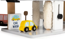 Die Garage ist aus robustem Holz gefertigt und hat glatte, sichere Kanten. Umfangreiches Zubehör einschließlich Waschstraße und Tankstelle beflügelt die Fantasie und verlängert die Spielzeit. Ein ideales Geschenk für Kinder ab 3 Jahren, das Motorik, Koordination und logisches Denken fördert.