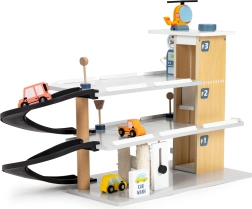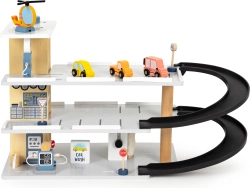 Diese mehrstöckige Holzgarage bietet Kindern eine echte Action-Zone: Autos flitzen über die Rampen zwischen den Etagen, halten an Verkehrsschildern und lassen sich dank des beweglichen Aufzugs bequem nach oben und unten transportieren. Auf dem Dach wartet ein Heliport, auf dem der beiliegende Hubschrauber landen kann.