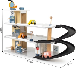 Drei Parkebenen, Abfahrtsrampen und eine Dachfläche als Landeplatz für den Hubschrauber bieten endlose Spielszenarien und das Erlernen von Verkehrssituationen.