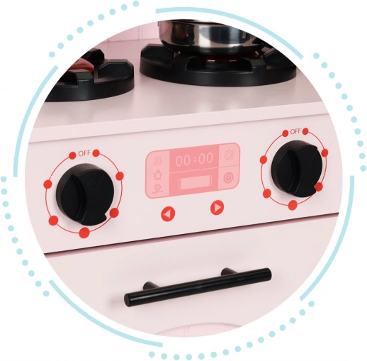 Die Drehknöpfe an der Küche ermöglichen das Simulieren von Kochen auf dem Herd und im Ofen. Kinder gewinnen so einen sicheren Raum für ihre kulinarischen Experimente.