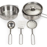 Das Set umfasst zwei Töpfe, einen Deckel, eine Kelle, einen Pfannenwender und einen Schaumlöffel aus Metall. Alle Werkzeuge sind so gestaltet, dass sie für die Verwendung durch Kinder sicher sind.