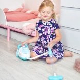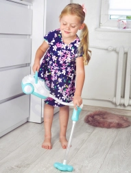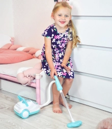 Der Staubsauger besteht aus widerstandsfähigen Kunststoffen und ist leicht, sodass Kinder ihn am praktischen Tragegriff einfach transportieren können. Der Schlauch mit Aufsatz ist bis zu 80 cm lang, wodurch auch kleinere Kinder ihn bequem bedienen. Ein öffnbares Fach für die „Verschmutzungen“ zeigt den Kindern das Ergebnis ihrer Arbeit und rundet das authentische Erlebnis ab.