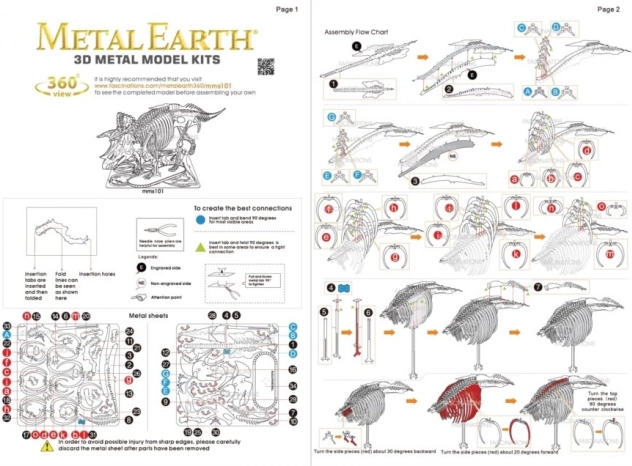 Entnehmen Sie die einzelnen Teile aus den Metallbögen; verwenden Sie bei Bedarf kleine Seitenschneider (nicht enthalten). Die Teile werden mittels Verriegelungen aus Zapfen und Öffnungen miteinander verbunden. Biegen Sie den Zapfen mit einer kleinen, feinen Zange um (nicht enthalten) und verbinden Sie nach und nach alle Verriegelungen, bis ein äußerst realistisches Meisterstück entsteht!