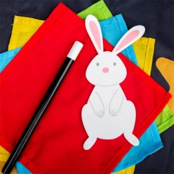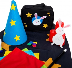 Alles Nötige in einem Set: Tasche, Umhang, Zauberstab, Karten, Becher, Hut, Häschen, Jetons und Tücher. Kinder können sofort loszaubern und das Publikum begeistern.
