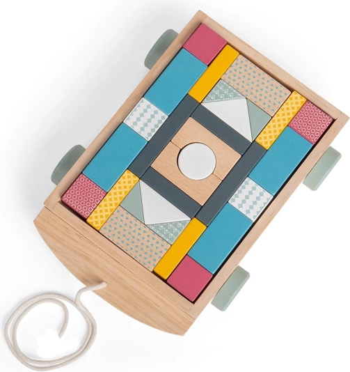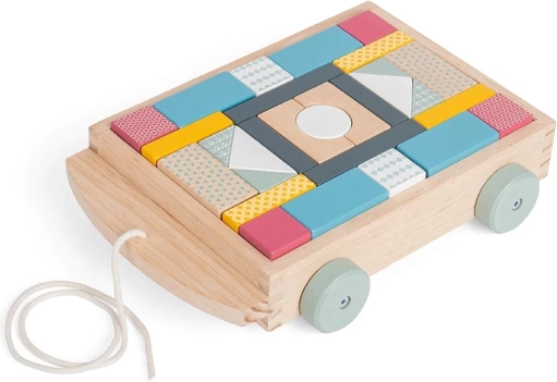 Das Ziehen des Wagens sowie das Stapeln und Sortieren der Klötze unterstützt Gleichgewicht, Feinmotorik und Hand-Auge-Koordination bereits ab 18 Monaten.