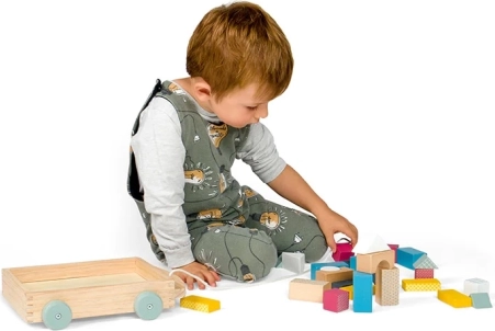 Der Holz-Wagen mit 29 farbigen Klötzen in modernen Pastelltönen ist ein großartiges Hilfsmittel für erste Bau-, Sortier- und Lernaktivitäten. Die Klötze haben angenehme Maße, liegen gut in der Hand und lassen sich wieder ordentlich im Wagen verstauen, der sich dank der robusten Zugleine leicht ziehen lässt. Das Spielzeug fördert Gleichgewicht, Koordination und Fantasie.