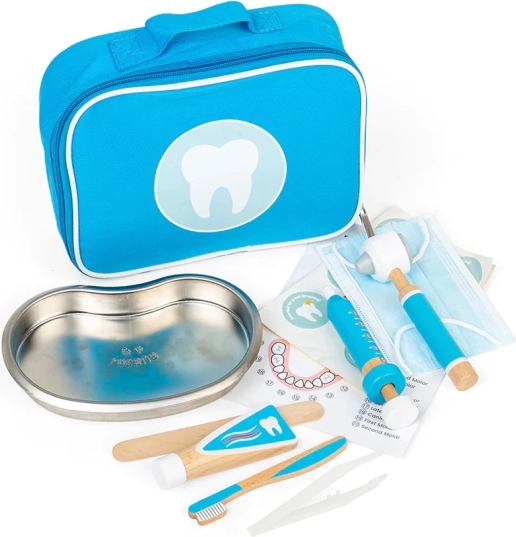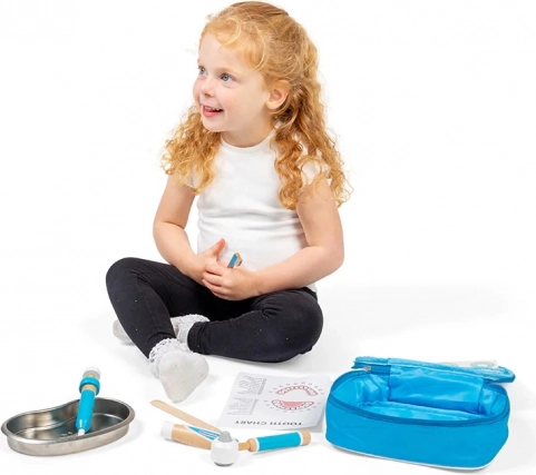 Der stylische blaue Koffer enthält alles, was kleine Zahnärzte brauchen: eine hölzerne Zahnbürste, eine Tube für Zahnpasta, eine Injektionsspritze, ein Otoskop, eine Pinzette, einen Mundschutz, ein Edelstahltablett, einen Aufkleber sowie eine Übersicht zum richtigen Zähneputzen. Kinder können so sicher ausprobieren, was sie beim Zahnarzt erwartet, und entwickeln ganz natürlich eine positive Einstellung zur Mundhygiene.