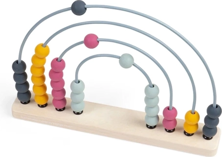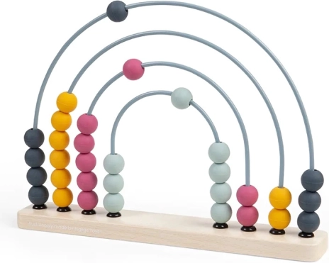 Der Sockel besteht aus FSC®-zertifiziertem Holz, die Bögen aus Metall und die Perlen aus Silikon in Lebensmittelqualität. Dank zeitloser Pastellfarben und der Regenbogenform eignet er sich auch als Designobjekt. Nach dem Spielen kann er ein Regal schmücken und weiterhin zum Entdecken der Zahlen anregen.