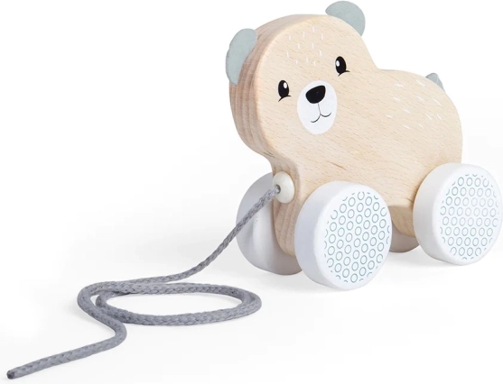 Dieser hölzerne Ziehbär mit Filzohren und -schwanz motiviert Kinder zur Bewegung und fördert die Hand-Auge-Koordination sowie die Grobmotorik. Dank der kompakten Maße liegt er gut in der Hand und fährt leicht über glatte Oberflächen.