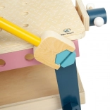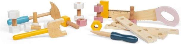 Enthalten sind Säge, Schraubenschlüssel, Hammer, Schraubendreher, Winkel, Muttern und Schrauben – alles in Pastellfarben und bereit zum Bauen und Gestalten.