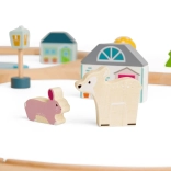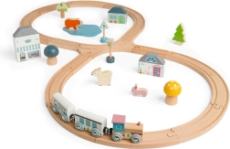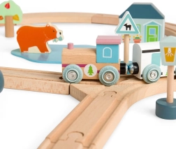 Diese Holzeisenbahn am Wald bietet jungen Entdeckerinnen und Entdeckern unendliche Möglichkeiten für kreatives Spiel. Die Acht-förmige Strecke führt an hübschen Fliegenpilzen, Kiefern und Waldtieren vorbei sowie an einem Café oder einer Bäckerei. Die hochwertige Verarbeitung und das robuste Design gewährleisten eine lange Lebensdauer und viel Freude für Kinder.