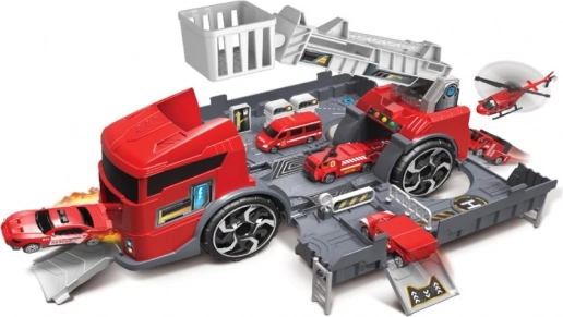Servicestation in Form eines Feuerwehrautos, die endlose Abenteuer bietet. Im Lieferumfang sind zwei Plastik-Mini-Autos enthalten, mit denen du noch mehr Spaß haben kannst.