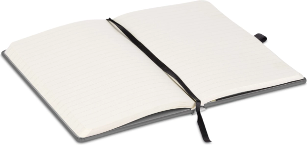 Das elastische Gummiband hält das Notizbuch sicher geschlossen, die Stiftschlaufe ist stets zur Hand und die hintere Papierstecktasche fasst Visitenkarten sowie kleine Notizen.