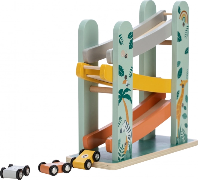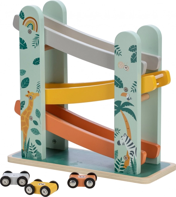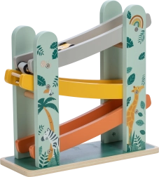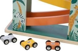 Wir präsentieren Ihnen eine großartige Holzrennbahn mit drei Autos! Nutzen Sie die farbenfrohe Streckenvariante und sehen Sie, wie Ihre Kinder mit Begeisterung zuschauen, wie die Autos von einem Stockwerk zum anderen purzeln. Ergänzt durch wunderschöne Tiermotiv-Illustrationen, die ihr einen spielerischen Charakter verleihen. Die Autos haben gummierte Räder für eine stabile Fahrt und ein zweiseitiges Design.
