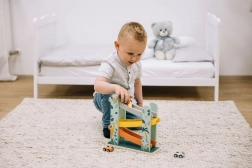 Dank der neigbaren Bahnen und kleinen Fahrzeuge fördert das Spielzeug die Entwicklung der Feinmotorik und die Hand-Augen-Koordination.