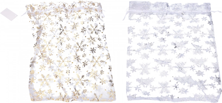 Eleganter Organzabeutel mit Weihnachtsflocken ist ideal zum Verpacken von Geschenken. Erhältlich in goldener und silberner Ausführung.