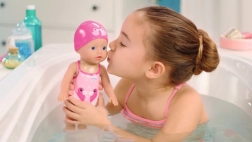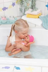 Der leichte, wasserfeste Puppenkörper ist ideal für Badewanne und Planschbecken – das Kind beobachtet, wie die Puppe schwimmt und auf der Oberfläche treibt.