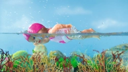 Der rosa Badeanzug mit fröhlichen Motiven und die passende Badekappe sorgen für noch mehr Freude und Farbe beim Baden.