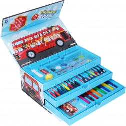 Der aufklappbare Kreativkoffer mit Busmotiv begeistert jedes kreative Kind. In der übersichtlich organisierten Box findet sich alles zum Zeichnen und Malen – von Buntstiften und Wachsmalstiften über Filzstifte bis hin zu Aquarellfarben. Dank des kompakten Designs ist der Koffer leicht zu transportieren und bereit für Spaß zu Hause, in der Schule und unterwegs.