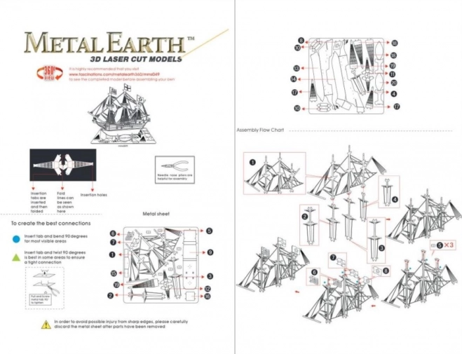 Entnehmen Sie die einzelnen Teile aus den Metallblechen; bei Bedarf verwenden Sie kleine Seitenschneider (nicht enthalten). Die Teile werden mittels Laschen und Löchern miteinander verbunden. Biegen Sie die Laschen mit kleinen, feinen Zangen (nicht enthalten) um und verbinden Sie nach und nach alle Verriegelungen, bis ein äußerst realistisches Meisterstück entsteht!