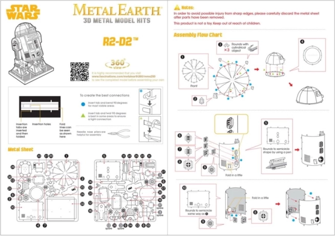 Entnehmen Sie die einzelnen Teile aus den Metallblechen; verwenden Sie bei Bedarf einen kleinen Seitenschneider (nicht enthalten). Die Teile werden mittels Verriegelungen verbunden, die aus einem Haken/Nasenstift und einer Öffnung bestehen. Biegen Sie die Nase mit einer kleinen, feinen Zange (nicht enthalten) um und verbinden Sie nach und nach alle Verriegelungen, bis ein äußerst realistisches Meisterstück entsteht!