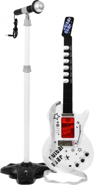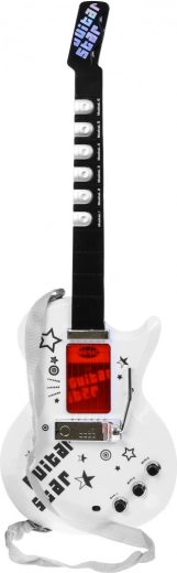 | | Einzigartige elektrische Gitarre für zukünftige Gitarristen zusammen mit einem Mikrofon im Set. Die Gitarre ist ein außergewöhnlich inspirierendes Saitenzupfinstrument, das eine äußerst wichtige Rolle im Blues, Country, Flamenco, Rock und in vielen Formen der Popmusik spielt. Schon in den ersten Lebensjahren zeigt ein Kind Interesse am Spielen mit Spielzeugen, tanzt, singt und versucht, auf einfachen Instrumenten zu spielen. Die Präsenz von Musik in der Entwicklung des Kindes hat eindeutig einen positiven Einfluss. Ein so früh entdecktes Talent hat die Chance, sich in Zukunft deutlich zu entfalten, daher sollte dieser Moment nicht verpasst werden. Wenn Ihr Kind Gitarristen mit unvorstellbarer Freude beobachtet, so tut, als würde es auf einer imaginären Gitarre spielen und ein Gefühl für Rhythmus hat – dann könnte es Talent für das Gitarrenspiel haben. Das Spielzeug ist mit 6 Metallseiten, 3 Gitarrensounds, 7 Melodien und 12 kurzen Soli ausgestattet. | Lieferumfang | - Gitarre mit verstellbarem Gurt (betrieben mit 3 AA-Batterien 3 x 1,5 V – nicht im Lieferumfang enthalten), - Mikrofon zur Stimmverstärkung, - verstellbares Stativ (2 Stufen), - Einstellung der Mikrofonhöhe, - MP3-Kabel, |
