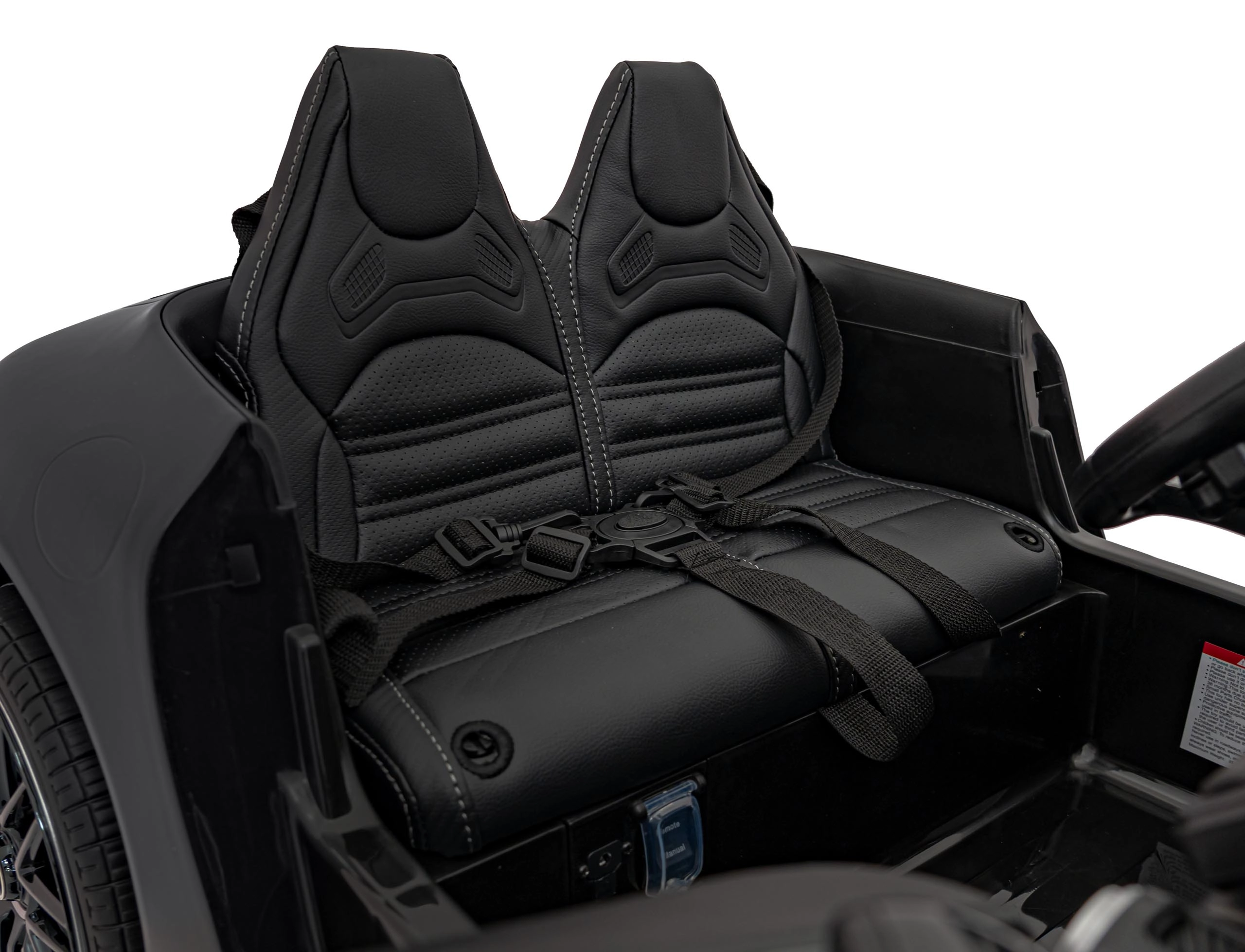 Weiche EVA‑Räder, ein Sitz aus Kunstleder mit Gurten sowie LED‑Lichter vorne und hinten sorgen für ein authentisches Fahrerlebnis.