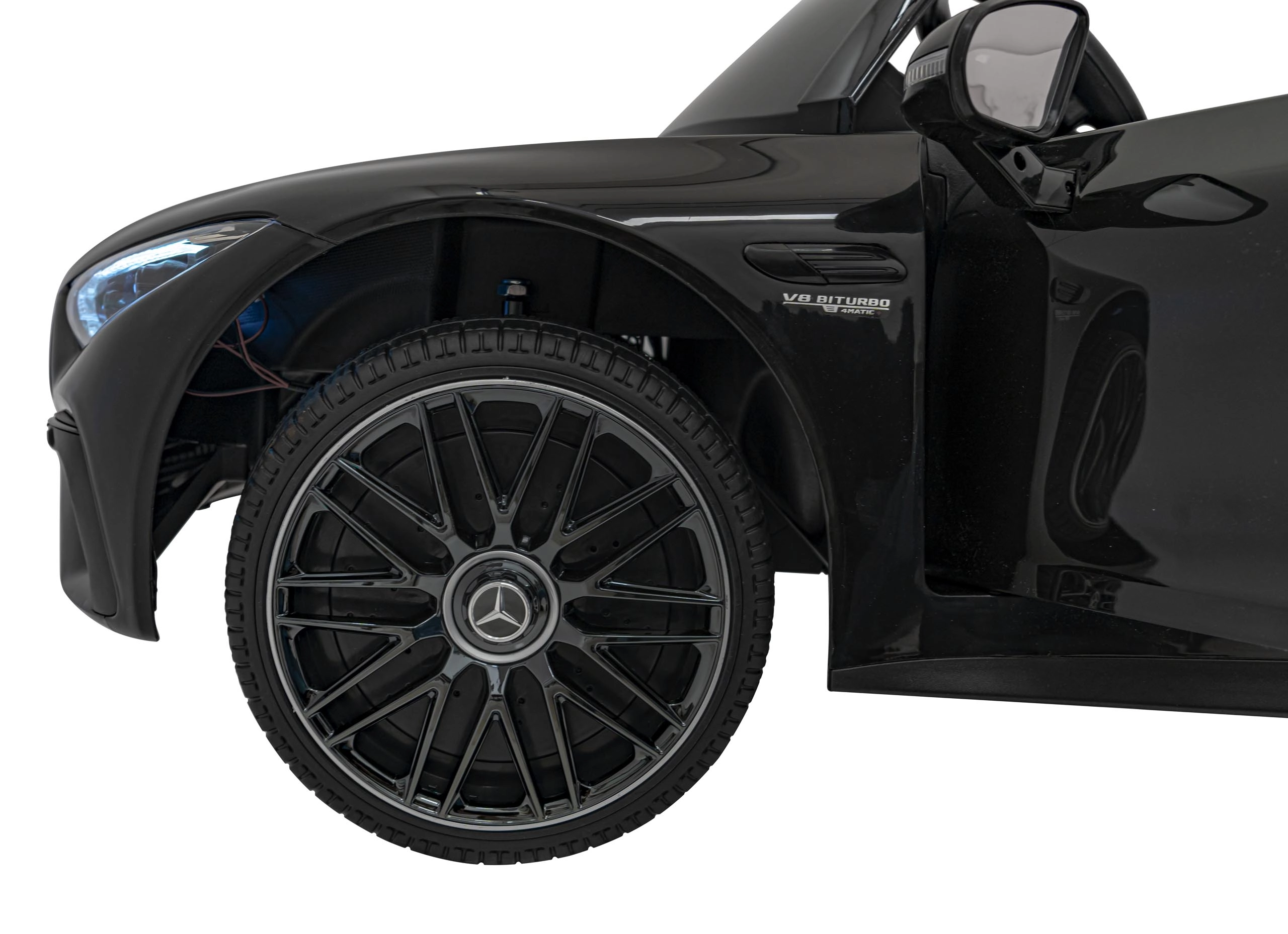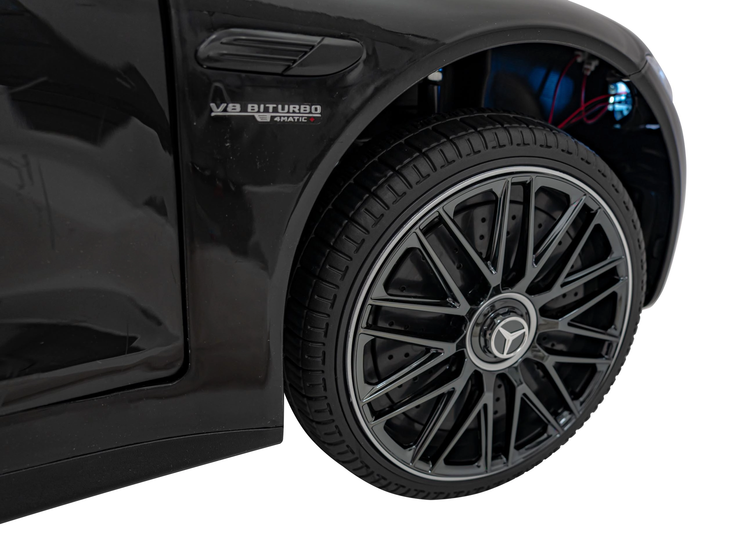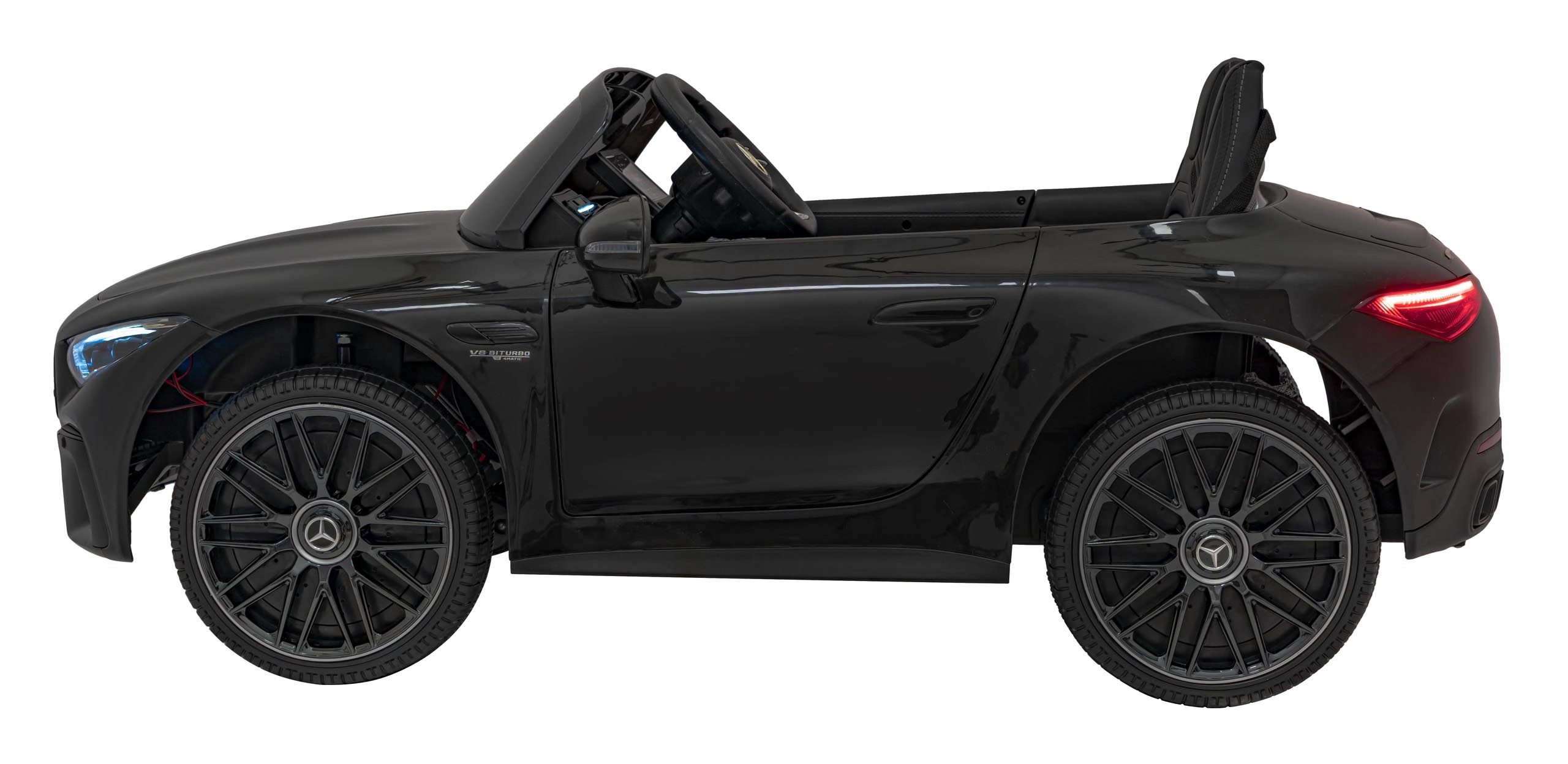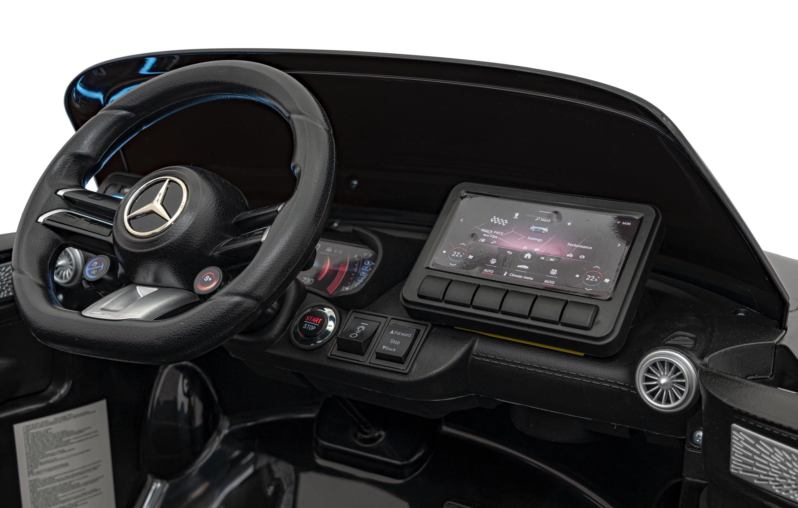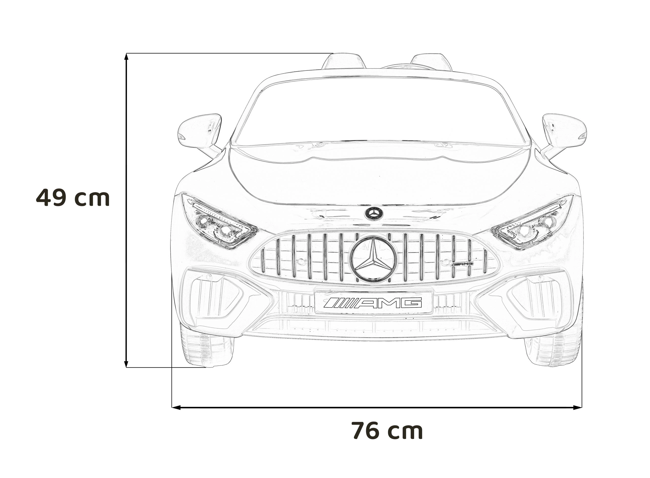 Großzügige Abmessungen von 123 × 76 × 49 cm, eine Traglast bis 35 kg und die geräumige Sitzfläche (46 × 19 × 25 cm) machen dieses Modell zur idealen Wahl für Kinder, die eine realistische Fahrt im ikonischen AMG‑Stil wünschen.